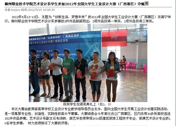 2012年5月21日,柳州教育局网站发布我院艺术设计系学生参加2012年全国大学生工业设计大赛(广西赛区)夺魁的信息。(崔智慧)