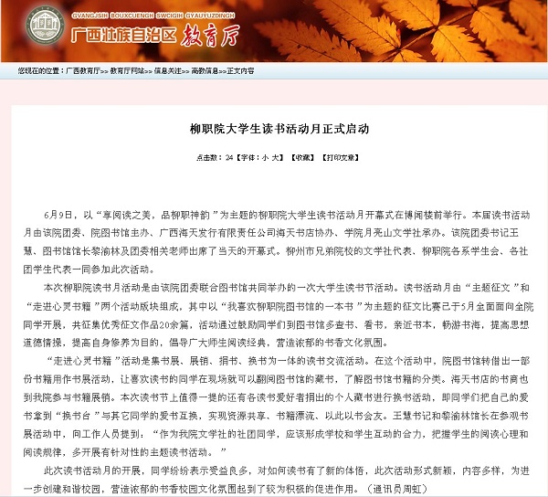广西教育厅网站发布我院大学生读书活动月正式启动的信息 来源:柳州职业技术学院新闻网 作者:崔智慧 编审: 发布时间:2012-06-18 浏览次数: 次 【字体:小 大】 分享到: 2012年6月15日,广西教育厅网站发布我院大学生读书活动月正式启动的信息。(崔智慧) 广西教育厅网站发布我院信息截图 关闭 打印正文