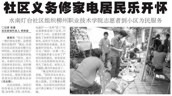 2012年6月9日,《柳州晚报》报道我院电子科技小组义务维修队进社区开展便民服务活动的新闻。(蒋玉梅)