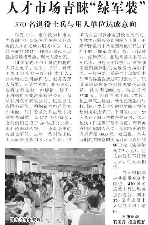 2012年6月21日,《柳州日报》报道我院职业技能培训班的退伍士兵在人才市场受亲睐的新闻。(蒋玉梅)