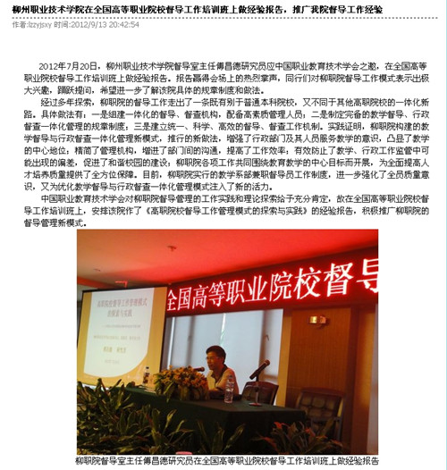 柳州教育局网站发布我院推广督导工作经验的信息 来源:柳州职业技术学院新闻网 作者:崔智慧 编审: 发布时间:2012-09-19 浏览次数: 次 【字体:小 大】 分享到: 2012年9月18日,柳州教育局网站发布我院推广督导工作经验的信息。(崔智慧) 柳州教育局网站发布我院信息截图 关闭 打印正文