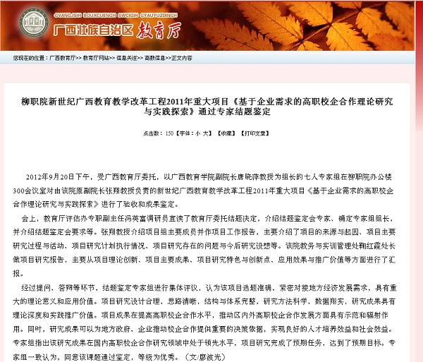 2012年9月28日,广西教育厅网站发布我院新世纪广西教育教学改革工程2011年重大项目《基于企业需求的高职校企合作理论研究与实践探索》通过专家结题鉴定的信息。(崔智慧)