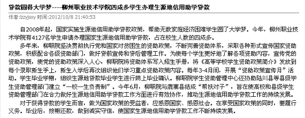 柳州教育局网站发布我院做好学生助学贷款工作的信息 来源:柳州职业技术学院新闻网 作者:崔智慧 编审: 发布时间:2012-10-16 浏览次数: 次 【字体:小 大】 分享到: 10月12日,柳州教育局网站发布我院做好学生助学贷款工作的信息。(崔智慧) 信息截图 关闭 打印正文
