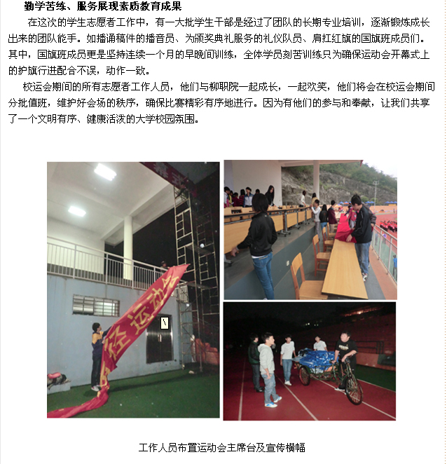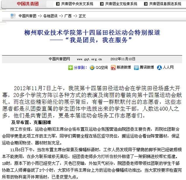 2012年11月10日,中国共青团网站发布“学院第十四届田径运动会特别报道——‘我是团员,我在服务’”的信息。(周虹)
