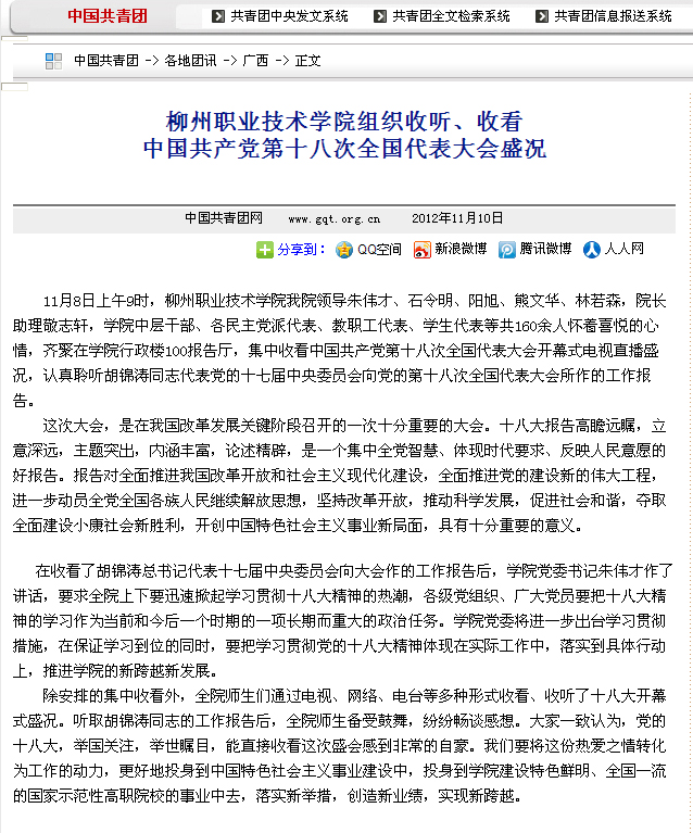 2012年11月10日,中国共青团网站发布“喜迎“十八大”系列报道:我院组织收听、收看中国共产党第十八次全国代表大会盛况”的信息。 (周虹)