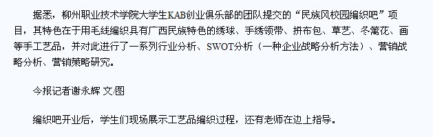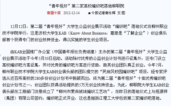 南国今报大篇幅刊发我院编织吧落地的新闻 来源:柳州职业技术学院新闻网 作者:石玉丹 编审: 发布时间:2012-12-14 浏览次数: 次 【字体:小 大】 分享到: 南国今报12月14日在第7版“坊间”显著位置以较大篇幅刊发我院编织吧落地的新闻。(石玉丹) 关闭 打印正文