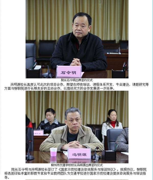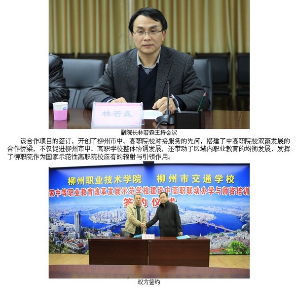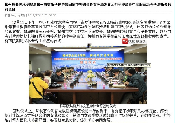 2012年12月13号,柳州教育局网站发布我院与柳州市交通学校签署国家中等职业教育改革发展示范学校建设中高职联动办学与师资培训项目协议的信息。(崔智慧)
