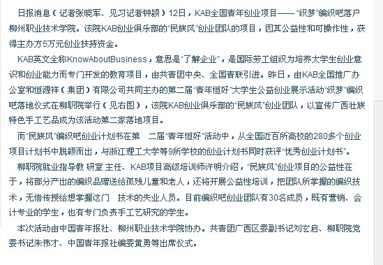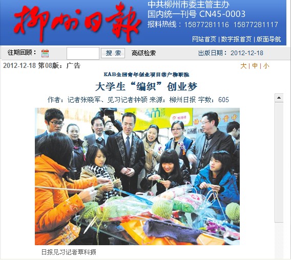 柳州日报刊发我院编织吧落地的新闻 来源:柳州职业技术学院新闻网 作者:石玉丹 编审: 发布时间:2012-12-18 浏览次数: 次 【字体:小 大】 分享到: 柳州日报12月18日第8版以“大学生‘编织’创业梦”为题刊发我院编织吧落地的新闻。(石玉丹) 关闭 打印正文