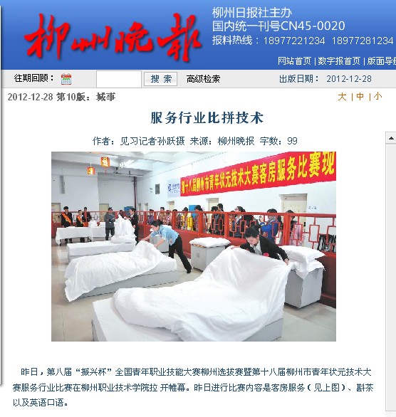 柳州晚报刊发我院举办青年状元技术大赛的新闻 来源:柳州职业技术学院新闻网 作者:石玉丹 编审: 发布时间:2012-12-28 浏览次数: 次 【字体:小 大】 分享到: 2012年12月28日柳州晚报在第10版以“服务行业比拼技术”为题,刊发了我院举办青年状元技术大赛的新闻。(石玉丹) 关闭 打印正文