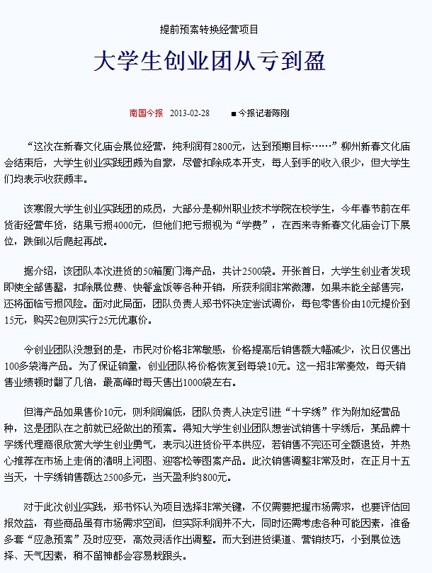 南国今报刊发我院学生开展创业实践的新闻 来源:柳州职业技术学院新闻网 作者:石玉丹 编审: 发布时间:2013-02-28 浏览次数: 次 【字体:小 大】 分享到: 南国今报2013年2月28日第29版以“大学生创业团从亏到盈”为题,刊发我院学生开展创业实践的新闻。(石玉丹) 关闭 打印正文