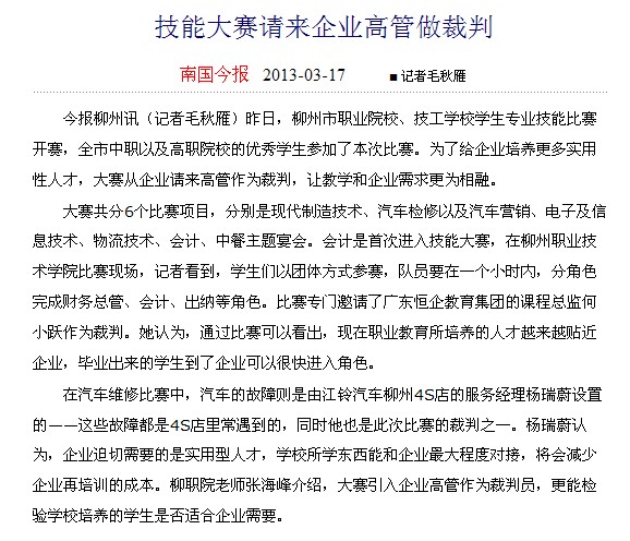 南国今报刊发我院承办2013年柳州市大中专院校学生专业技能比赛的新闻 来源:柳州职业技术学院新闻网 作者:石玉丹 编审: 发布时间:2013-03-17 浏览次数: 次 【字体:小 大】 分享到: 2013年3月17日南国今报在第6版要闻版刊发我院承办2013年柳州市大中专院校学生专业技能比赛的新闻。(石玉丹) 关闭 打印正文