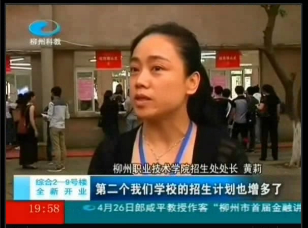2013年4月20日,柳州电视台《新播报》栏目播出我院参加2013年广西示范性高职高专单独对口招生联合测试并作为考点的新闻。(截图/朱敬民)