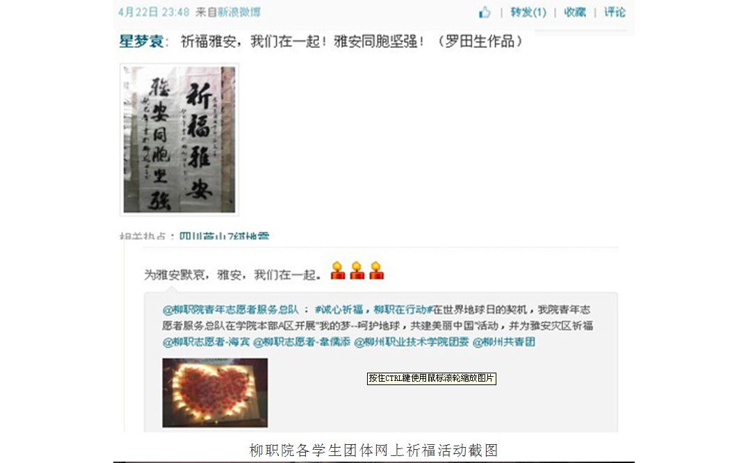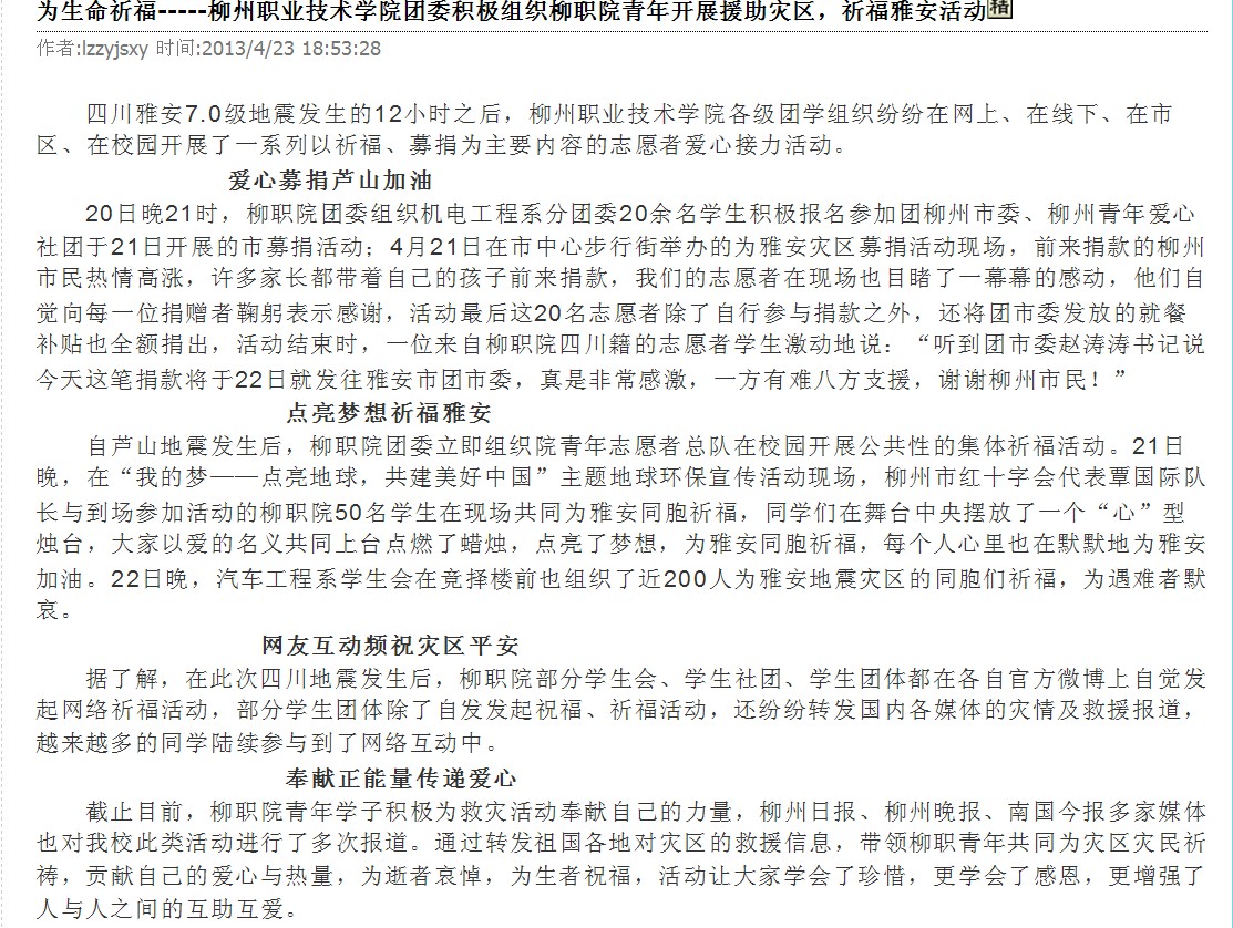 柳州教育局网站发布我院学生为雅安祈福的信息 来源:柳州职业技术学院新闻网 作者:崔智慧 编审: 发布时间:2013-04-25 浏览次数: 次 【字体:小 大】 分享到: 2013年4月24日,柳州教育局网站发布我院学生为雅安祈福的信息。(崔智慧) 信息截图 关闭 打印正文