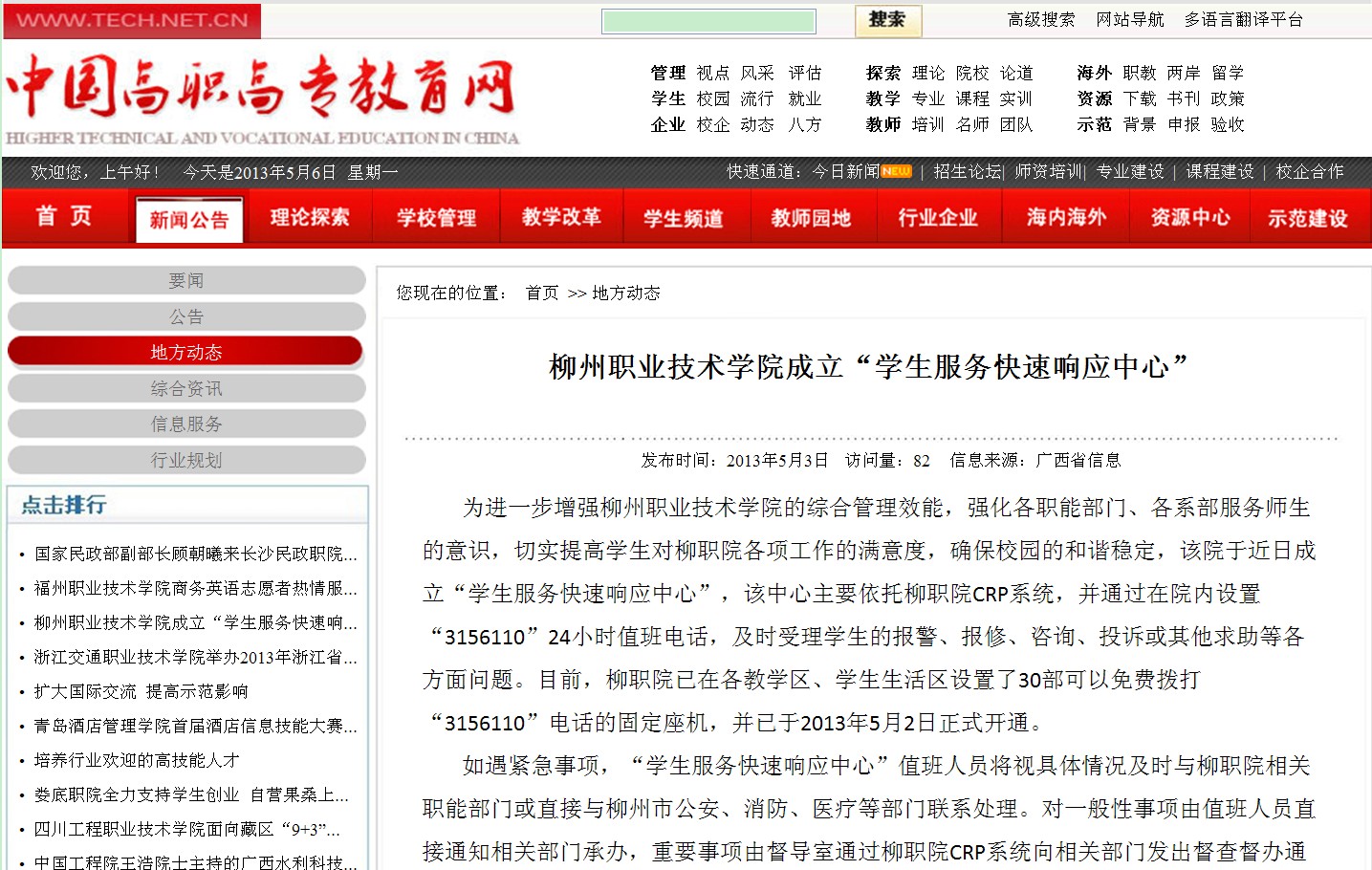 中国高职高专网发布我院成立“学生服务快速响应中心”的信息 来源:柳州职业技术学院新闻网 作者:崔智慧 编审: 发布时间:2013-05-06 浏览次数: 次 【字体:小 大】 分享到: 2013年5月3日,中国高职高专网发布我院成立“学生服务快速响应中心”的信息。(崔智慧) 信息截图 关闭 打印正文