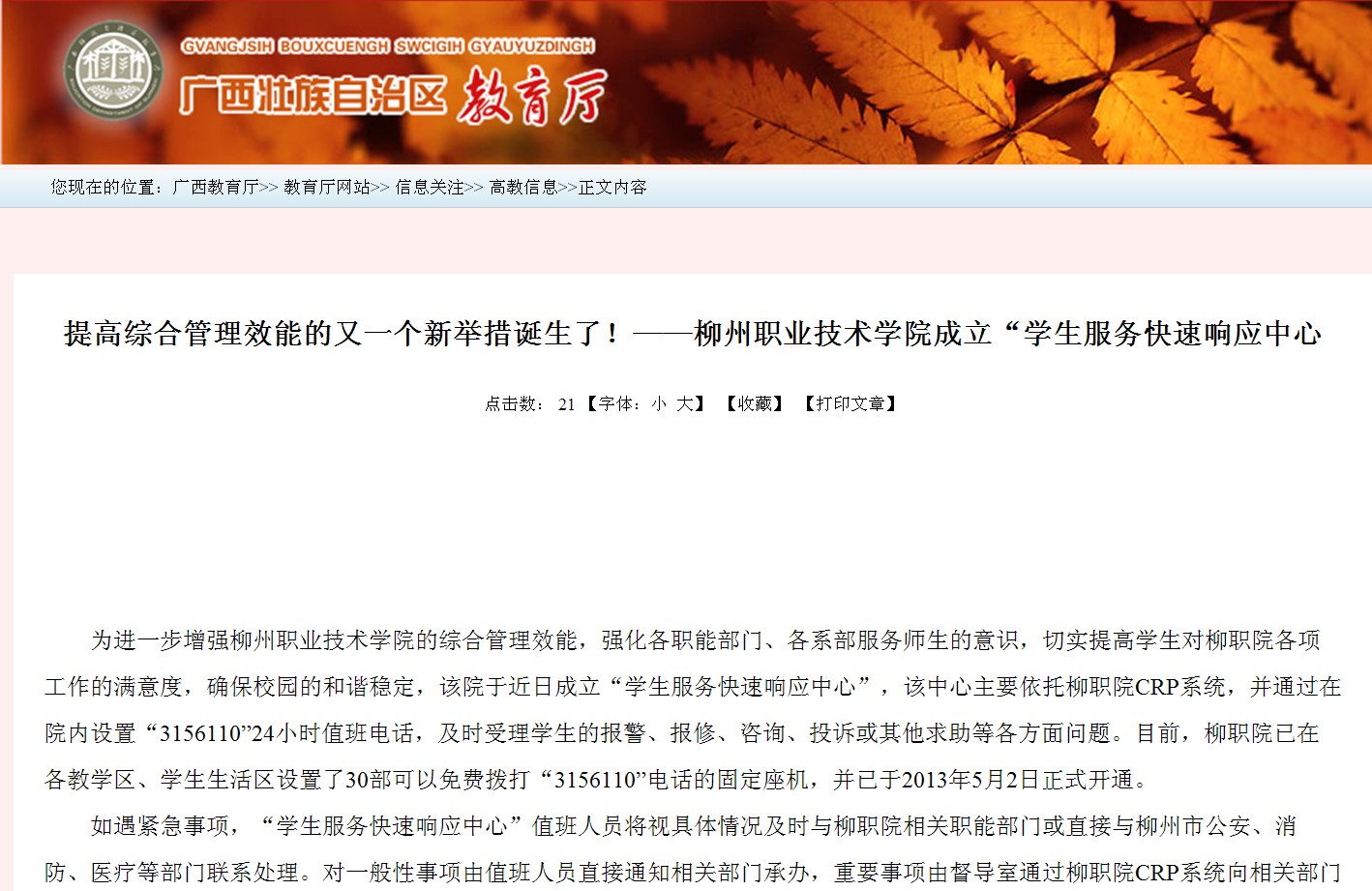 广西教育厅网发布我院成立“学生服务快速响应中心”的信息 来源:柳州职业技术学院新闻网 作者:崔智慧 编审: 发布时间:2013-05-06 浏览次数: 次 【字体:小 大】 分享到: 2013年5月3日,广西教育厅网发布我院成立“学生服务快速响应中心”的信息。(崔智慧) 信息截图 关闭 打印正文