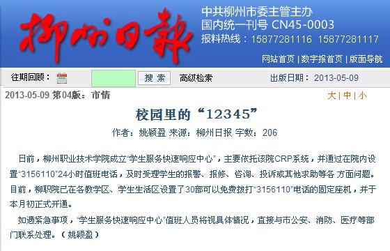 柳州日报刊发我院成立学生服务快速响应中心的消息 来源:柳州职业技术学院新闻网 作者:石玉丹 编审: 发布时间:2013-05-09 浏览次数: 次 【字体:小 大】 分享到: 柳州日报2013年5月9日在第4版、以“校园里的12345”为题,刊发我院成立学生服务快速响应中心的消息。(石玉丹) 关闭 打印正文