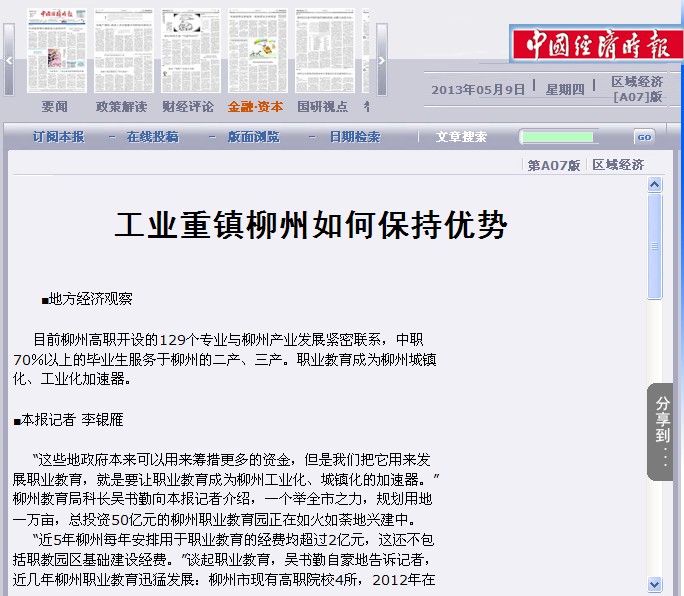 中国经济时报刊发朱伟才书记介绍我院校企合作办学模式的新闻 来源:柳州职业技术学院新闻网 作者:石玉丹 编审: 发布时间:2013-05-10 浏览次数: 次 【字体:小 大】 分享到: 中国经济时报2013年5月9日在第A07版、以“工业重镇柳州如何保持优势”为题,刊发朱伟才书记介绍我院校企合作办学模式的新闻。(石玉丹) 关闭 打印正文