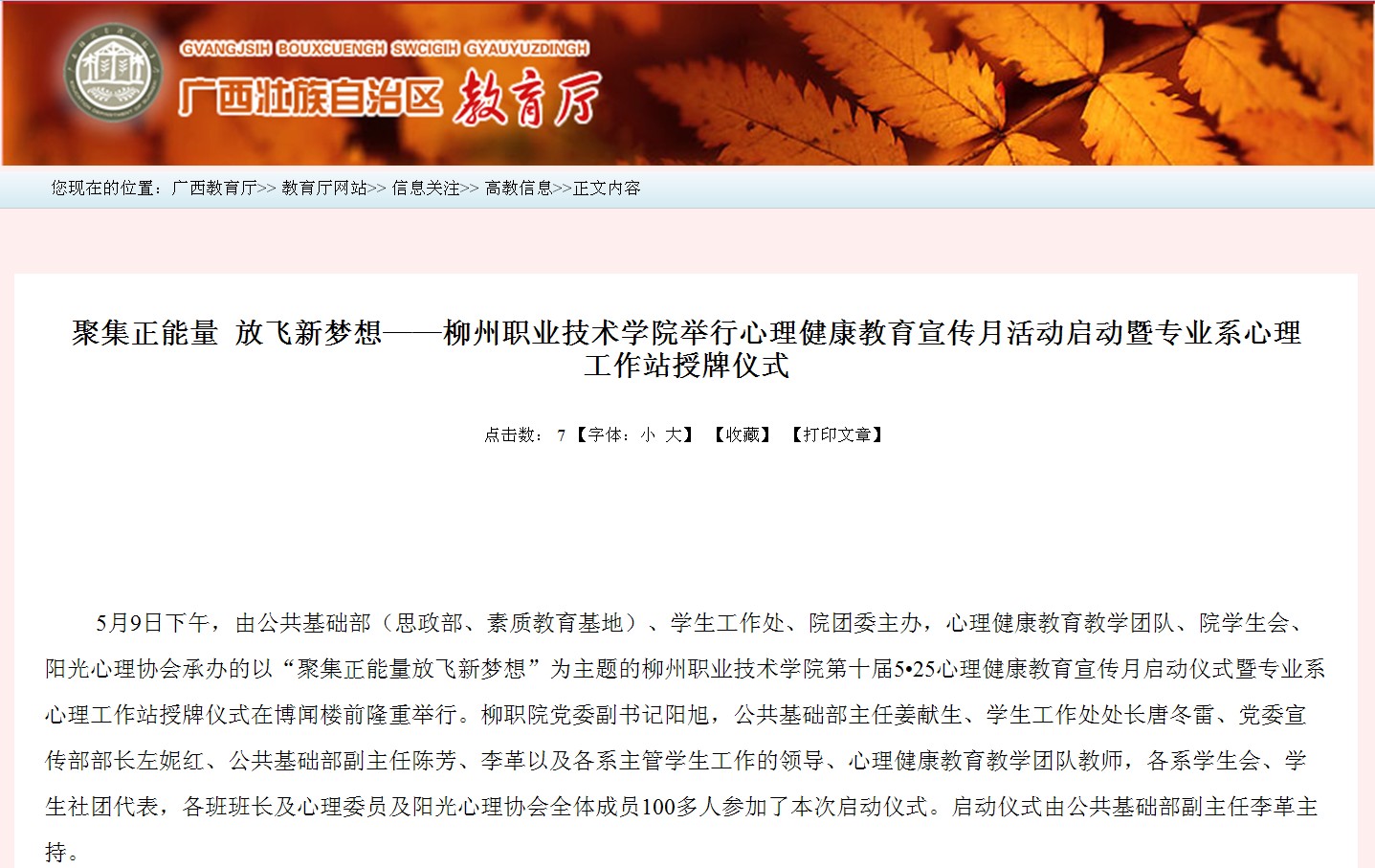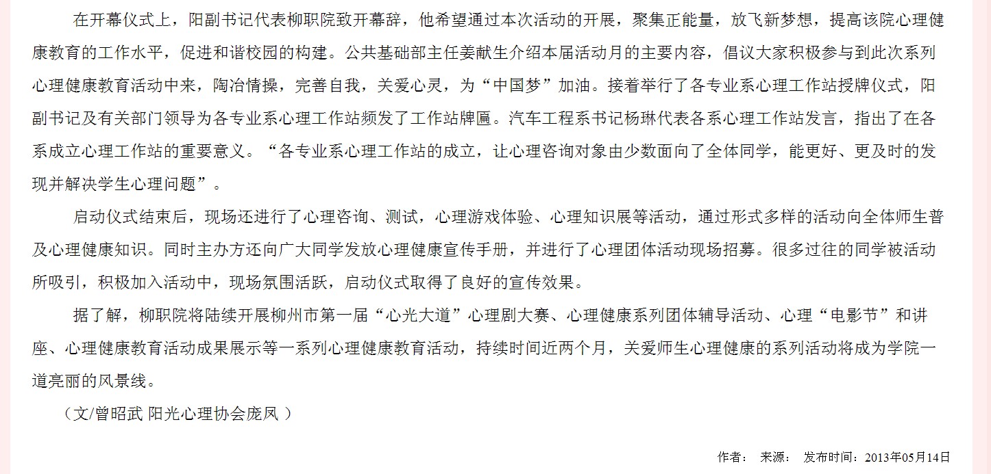 广西教育厅网站发布我院举行心理健康教育宣传月活动启动暨专业系心理工作站授牌仪式的信息 来源:柳州职业技术学院新闻网 作者:崔智慧 编审: 发布时间:2013-05-15 浏览次数: 次 【字体:小 大】 分享到: 2013年5月14日,广西教育厅网站发布我院举行心理健康教育宣传月活动启动暨专业系心理工作站授牌仪式的信息。(崔智慧) 信息截图 关闭 打印正文
