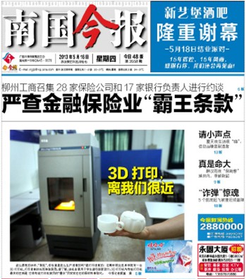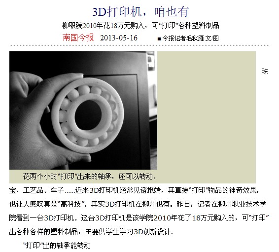 南国今报刊发我院拥有3D打印技术的新闻 来源:柳州职业技术学院新闻网 作者:石玉丹 编审: 发布时间:2013-05-16 浏览次数: 次 【字体:小 大】 分享到: 南国今报2013年5月16日在头版以主图导读、在第6版要闻版以大篇幅报道的形式,刊发我院拥有3D打印技术的新闻。(石玉丹) 关闭 打印正文