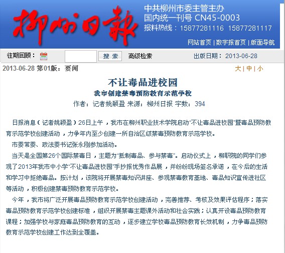 柳州日报刊发我院启动“不让毒品进校园”的新闻 来源:柳州职业技术学院新闻网 作者:石玉丹 编审: 发布时间:2013-06-28 浏览次数: 次 【字体:小 大】 分享到: 柳州日报2013年6月28日头版,以“不让毒品进校园”为题,刊发我院启动毒品预防教育示范学校创建活动的新闻。 (截图:石玉丹) 关闭 打印正文