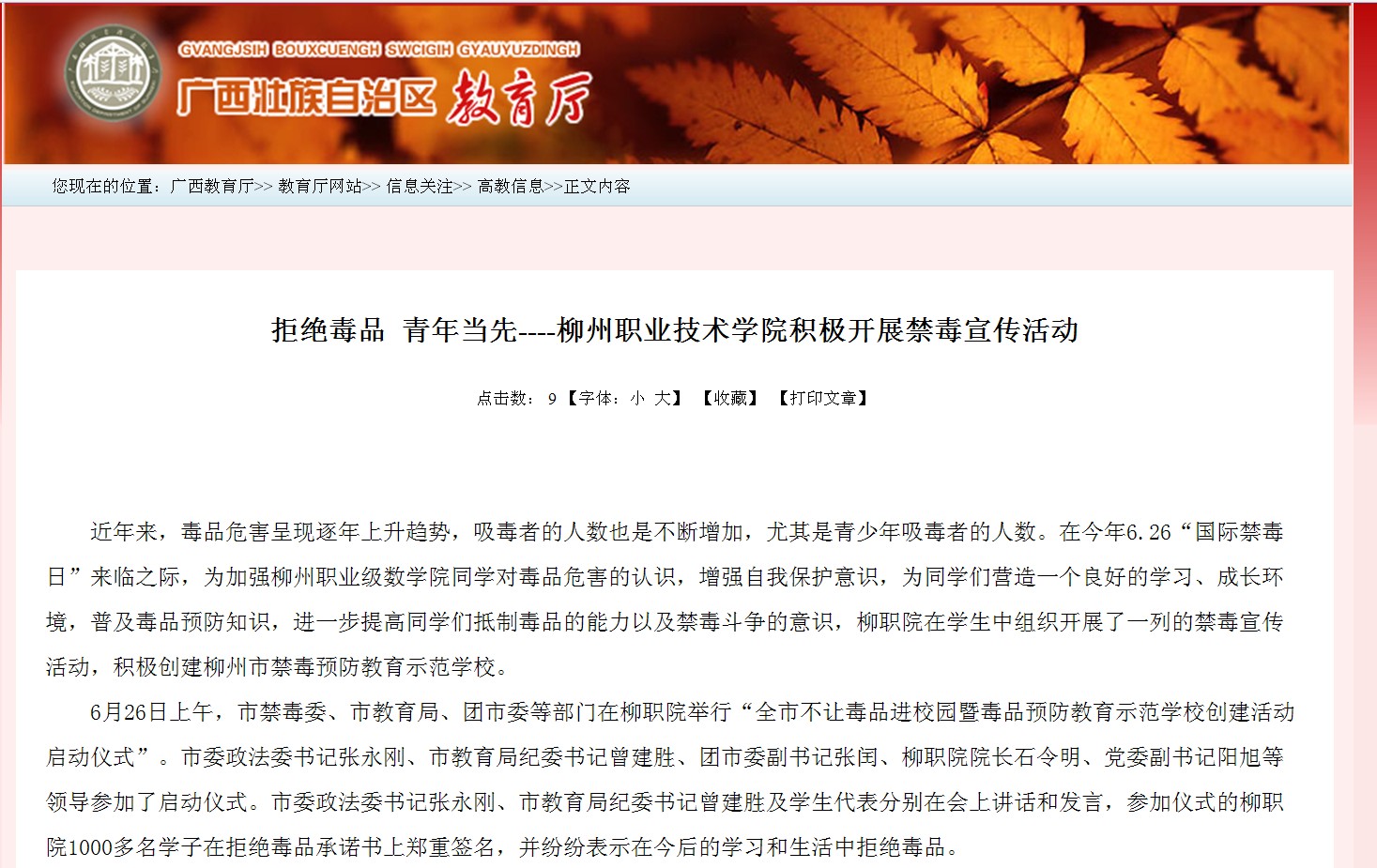 广西教育厅网站发布我院积极开展禁毒宣传活动的信息 来源:柳州职业技术学院新闻网 作者:崔智慧 编审: 发布时间:2013-07-03 浏览次数: 次 【字体:小 大】 分享到: 2013年7月2日,广西教育厅网站发布我院积极开展禁毒宣传活动的信息。(崔智慧) 信息截图 关闭 打印正文