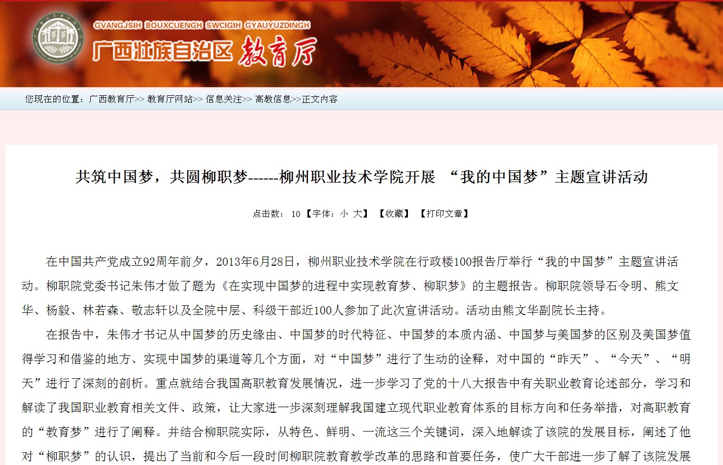 广西教育厅网站发布我院开展 “我的中国梦”主题宣讲活动的信息 来源:柳州职业技术学院新闻网 作者:崔智慧 编审: 发布时间:2013-07-03 浏览次数: 次 【字体:小 大】 分享到: 2013年7月2日,广西教育厅网站发布我院开展 “我的中国梦”主题宣讲活动的信息。(崔智慧) 信息截图 关闭 打印正文