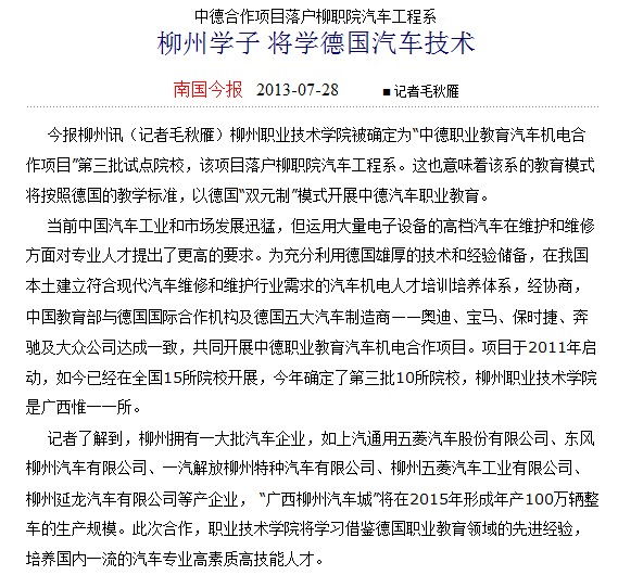南国今报刊发中德项目落户我院的消息 来源:柳州职业技术学院新闻网 作者:石玉丹 编审: 发布时间:2013-07-29 浏览次数: 次 【字体:小 大】 分享到: 2013年7月28日南国今报在第二版要闻版以“中德合作项目落户柳职院汽车工程系”为引题、“柳州学子将学德国汽车技术”为主题,刊发中德项目落户我院的消息。(截图:石玉丹) 关闭 打印正文