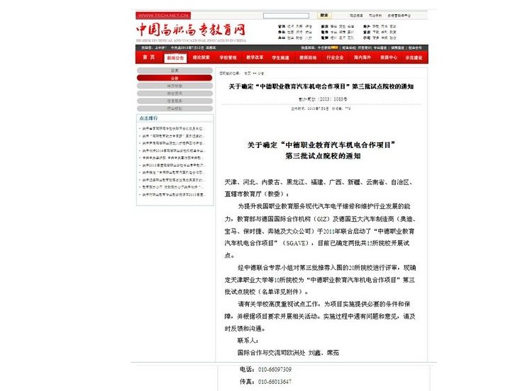 柳州教育局网站发布我院已被确定为“中德职业教育汽车机电合作项目”第三批试点院校的信息 来源:柳州职业技术学院新闻网 作者:崔智慧 编审: 发布时间:2013-08-02 浏览次数: 次 【字体:小 大】 分享到: 2013年7月22日,柳州教育局网站发布我院已被确定为“中德职业教育汽车机电合作项目”第三批试点院校的信息。(崔智慧) 关闭 打印正文