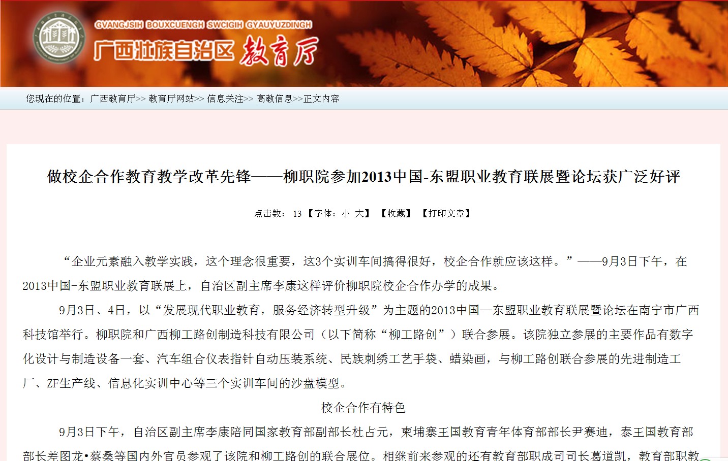 广西教育厅网站发布我院参加2013中国-东盟职业教育联展暨论坛获广泛好评的信息 来源:柳州职业技术学院新闻网 作者:崔智慧 编审: 发布时间:2013-09-09 浏览次数: 次 【字体:小 大】 分享到: 2013年9月9日,广西教育厅网站发布我院参加2013中国-东盟职业教育联展暨论坛获广泛好评的信息。(崔智慧) 信息截图 关闭 打印正文