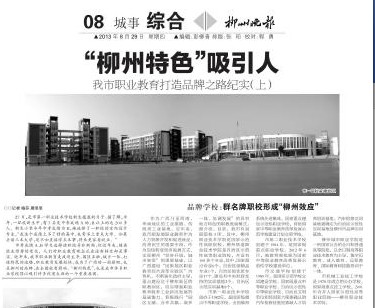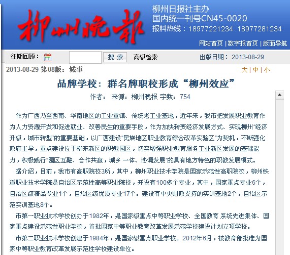 柳州晚报近期刊发我院的新闻 来源:柳州职业技术学院新闻网 作者:石玉丹 编审: 发布时间:2013-09-11 浏览次数: 次 【字体:小 大】 分享到: 2013年8月29日,柳州晚报第8版以《柳州特色吸引人》为题刊发我院的新闻。(截图:石玉丹) 关闭 打印正文
