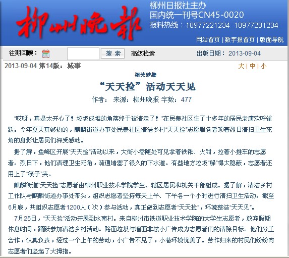 柳州晚报近日刊发我院大学生志愿者参与清洁社区活动的新闻 来源:柳州职业技术学院新闻网 作者:石玉丹 编审: 发布时间:2013-09-11 浏览次数: 次 【字体:小 大】 分享到: 2013年9月4日,柳州晚报在第14版以《‘天天捡’活动天天见》为题,刊发我院大学生志愿者参与清洁社区活动的新闻。 (截图:石玉丹) 关闭 打印正文