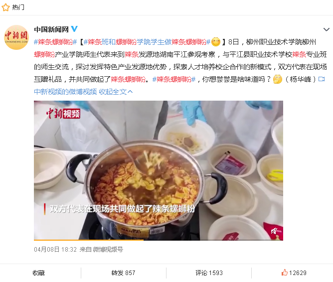 2021年4月8日,中国新闻网新浪微博以《辣条班和螺蛳粉学院学生做辣条螺蛳粉》为题,刊发我校新闻。详情点击:https://video.weibo.com/show?fid=1034:4623772783935564(链接、截图:刘晓燕)