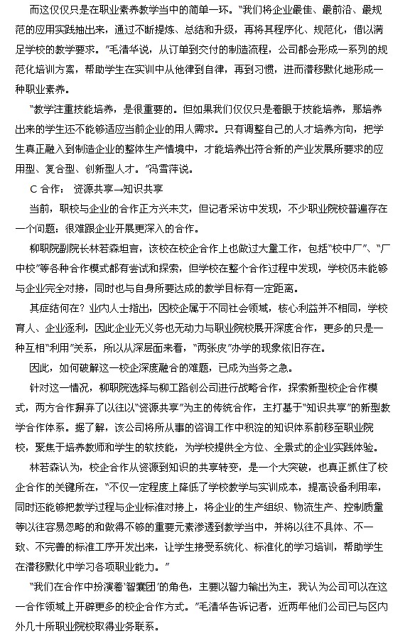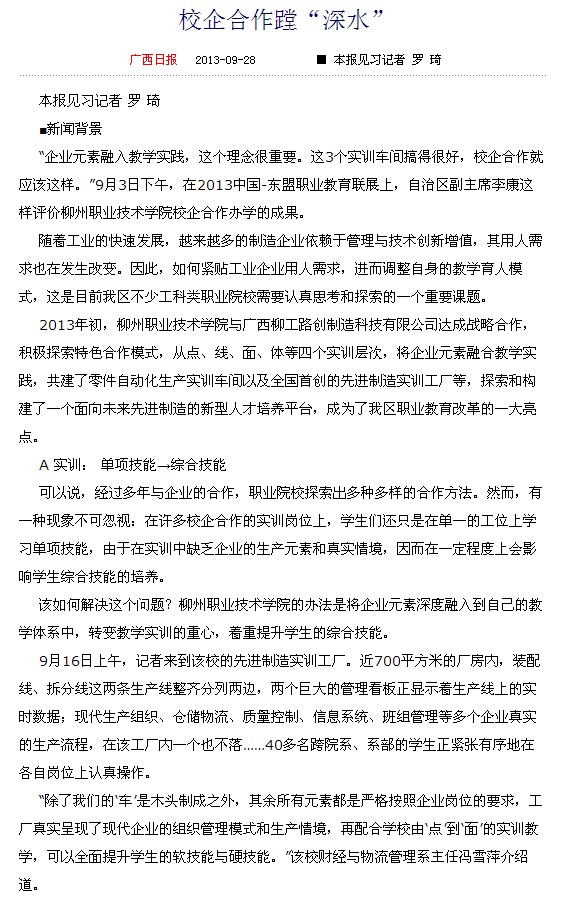 广西日报刊发我院校企合作办学的新闻 来源:柳州职业技术学院新闻网 作者:石玉丹 编审: 发布时间:2013-09-29 浏览次数: 次 【字体:小 大】 分享到: 2013年9月28日,广西日报在第7版教育版以《校企合作蹚“深水”》为题,刊发我院校企合作办学的新闻。(截图:石玉丹) 关闭 打印正文