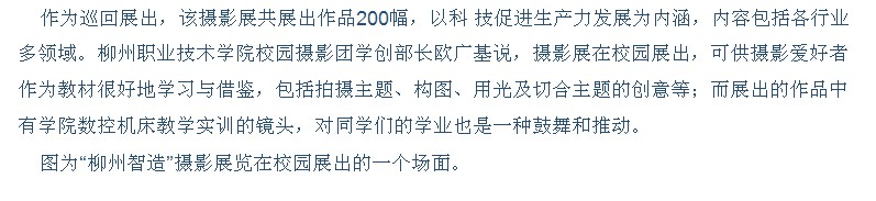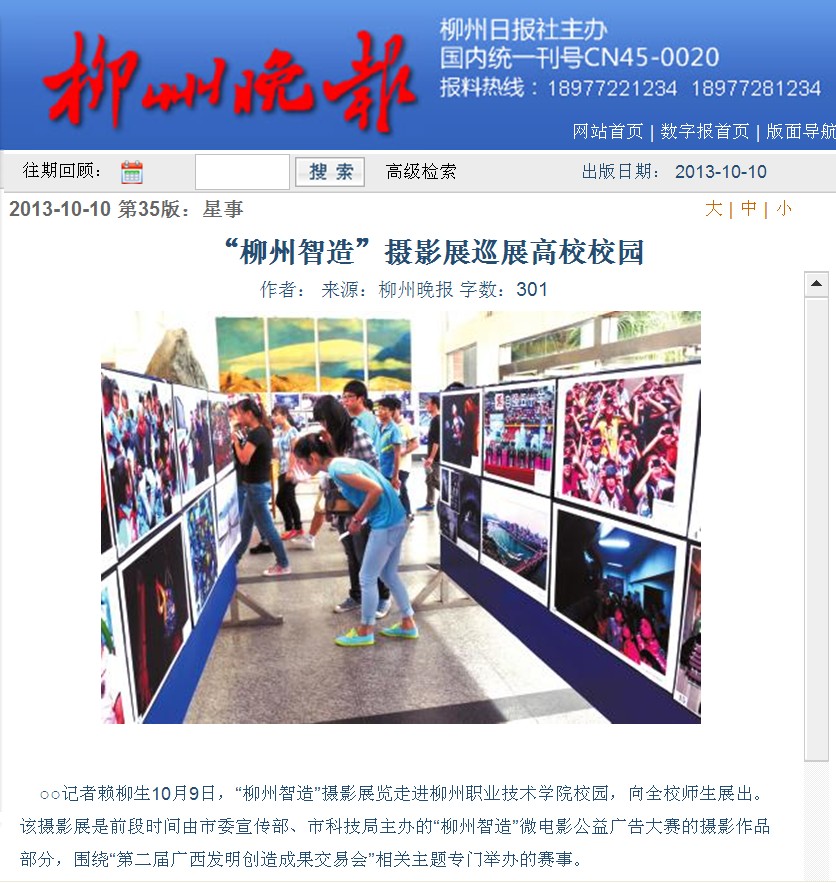 柳州晚报刊发“柳州智造”摄影展进我校校园的图片新闻 来源:柳州职业技术学院新闻网 作者:石玉丹 编审: 发布时间:2013-10-10 浏览次数: 次 【字体:小 大】 分享到: 2013年10月10日,柳州晚报在第35版以“‘柳州智造’摄影展巡展高校校园”为题,刊发我院的图片新闻。(截图:石玉丹) 关闭 打印正文