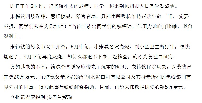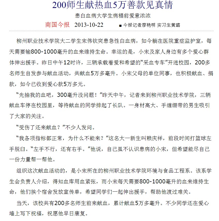 南国今报刊发我院学生捐款献血救助同学的新闻 来源:柳州职业技术学院新闻网 作者:石玉丹 编审: 发布时间:2013-10-22 浏览次数: 次 【字体:小 大】 分享到: 2013年10月22日南国今报在第4版要闻版以《200师生献热血5万善款见真情》为题,大篇幅刊发我院学生捐款献血救助同学的新闻。(截图:石玉丹) 关闭 打印正文