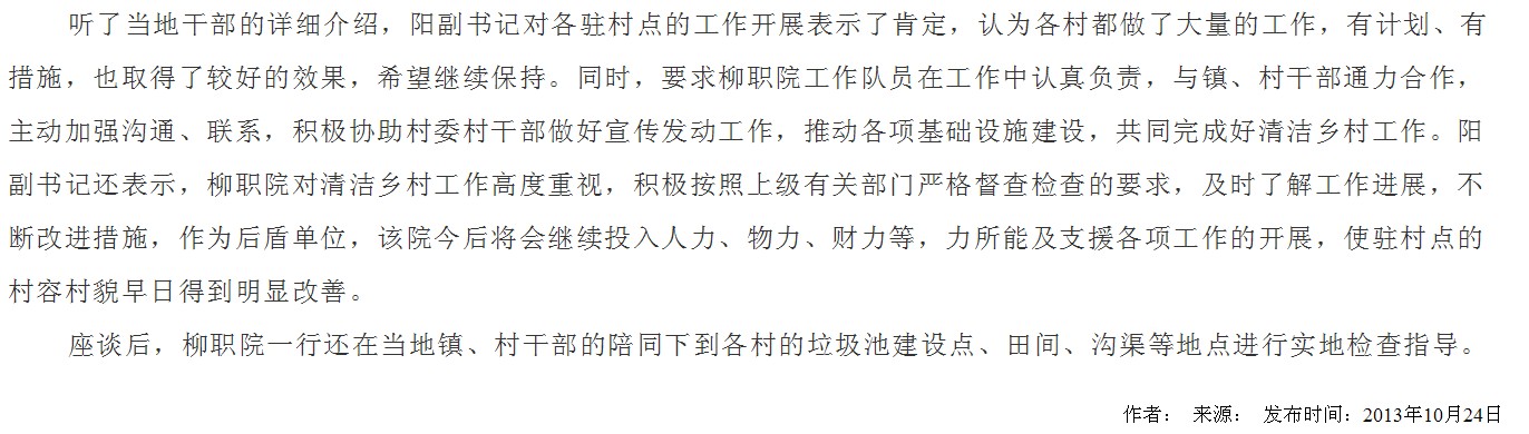 广西教育厅网站发布我院领导到学院“美丽广西•清洁乡村”活动驻村点检查指导的信息 来源:柳州职业技术学院新闻网 作者:崔智慧 编审: 发布时间:2013-10-25 浏览次数: 次 【字体:小 大】 分享到: 2013年10月24日,广西教育厅网站发布我院领导到学院“美丽广西?清洁乡村”活动驻村点检查指导的信息。(崔智慧) 信息截图 关闭 打印正文