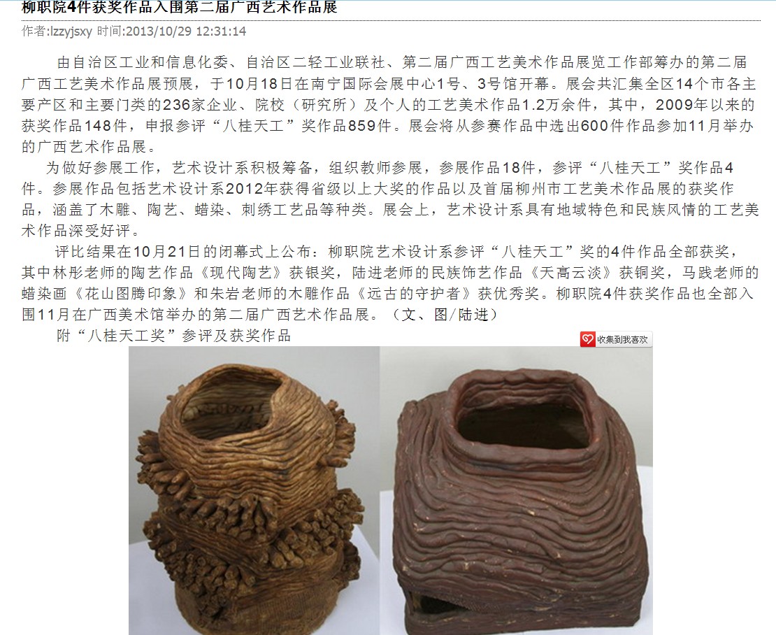 柳州教育局网站发布我院4件获奖作品入围第二届广西艺术作品展的信息 来源:柳州职业技术学院新闻网 作者:崔智慧 编审: 发布时间:2013-10-30 浏览次数: 次 【字体:小 大】 分享到: 2013年10月30日,柳州教育局网站发布我院4件获奖作品入围第二届广西艺术作品展的信息。(崔智慧) 信息截图 关闭 打印正文