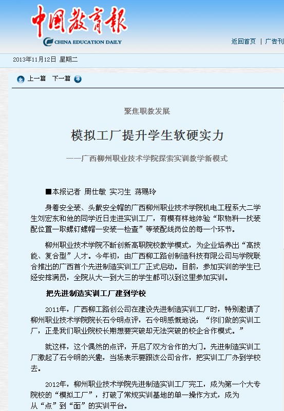 中国教育报近日刊发我院以模拟工厂提升学生实力的新闻 来源:柳州职业技术学院新闻网 作者:石玉丹 编审: 发布时间:2013-11-12 浏览次数: 次 【字体:小 大】 分享到: 2013年11月12日,中国教育报在第8版,以《模拟工厂提升学生软硬实力》为题,刊发我院以先进模式办学见实效的新闻。(截图:石玉丹) 关闭 打印正文