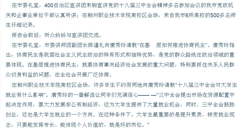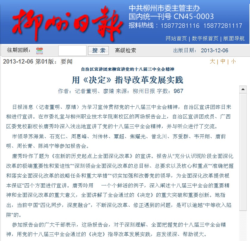 柳州日报刊发我院举办十八届三中全会精神宣讲活动的新闻 来源:柳州职业技术学院新闻网 作者:石玉丹 编审: 发布时间:2013-12-10 浏览次数: 次 【字体:小 大】 分享到: 2013年12月6日,柳州日报在第6版,以《用“决定”指导改革发展实践》为题,刊发我院举办十八届三中全会精神宣讲活动的新闻。(截图:石玉丹) 关闭 打印正文