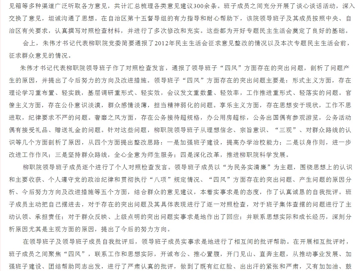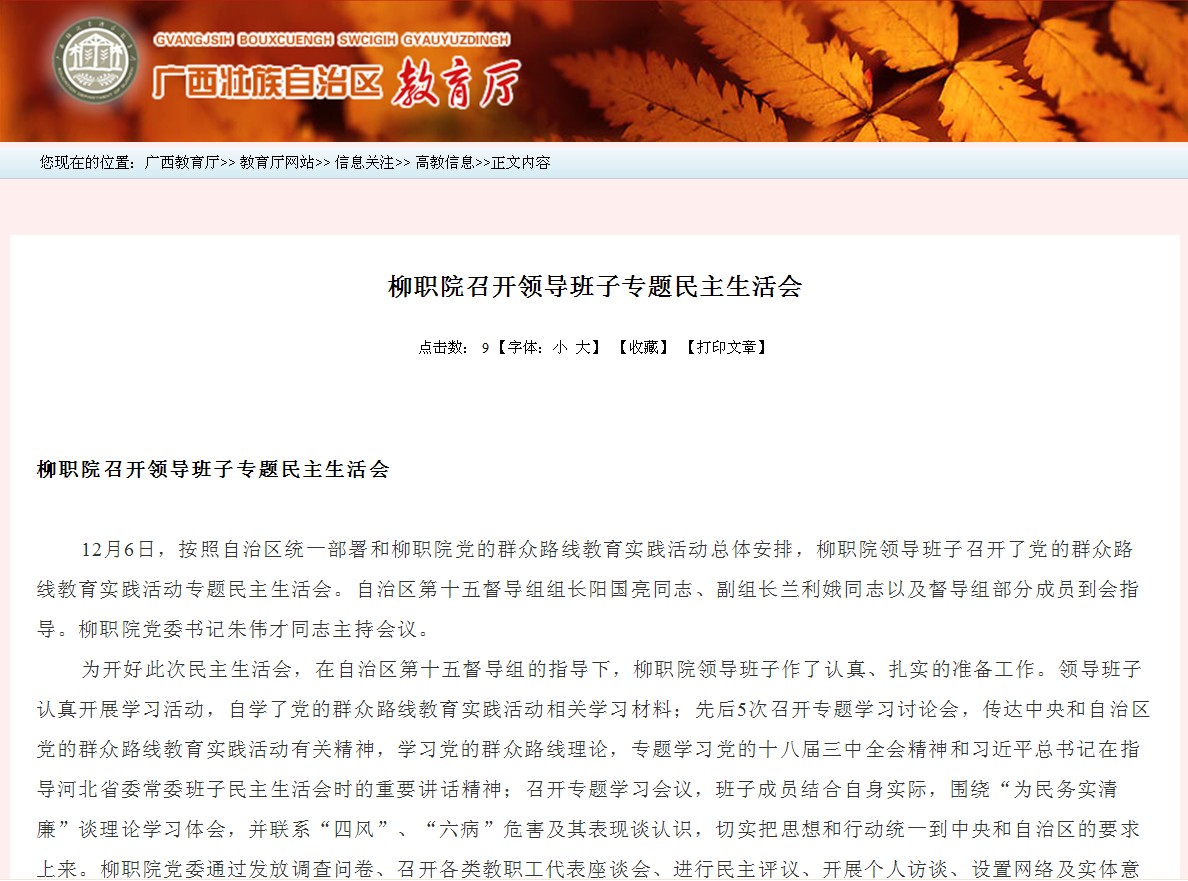 广西教育厅网站发布我院召开领导班子专题民主生活会的信息 来源:柳州职业技术学院新闻网 作者:崔智慧 编审: 发布时间:2013-12-16 浏览次数: 次 【字体:小 大】 分享到: 12月16日,广西教育厅网站发布我院召开领导班子专题民主生活会的信息。(崔智慧) 信息截图 关闭 打印正文