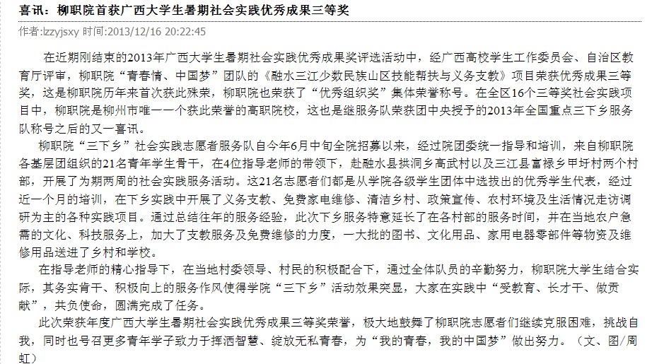 柳州教育局网站发布我院社会实践成果获表彰的信息 来源:柳州职业技术学院新闻网 作者:崔智慧 编审: 发布时间:2013-12-17 浏览次数: 次 【字体:小 大】 分享到: 2013年12月17日,柳州教育局网站发布我院社会实践成果获表彰的信息。(崔智慧) 信息截图 关闭 打印正文