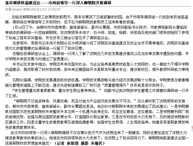 柳州教育局网站发布覃超副市长到我院调研的信息 来源:柳州职业技术学院新闻网 作者:崔智慧 编审: 发布时间:2014-01-20 浏览次数: 次 【字体:小 大】 分享到: 2014年1月20日,柳州教育局网站发布覃超副市长到我院调研的信息。(崔智慧) 信息截图 关闭 打印正文