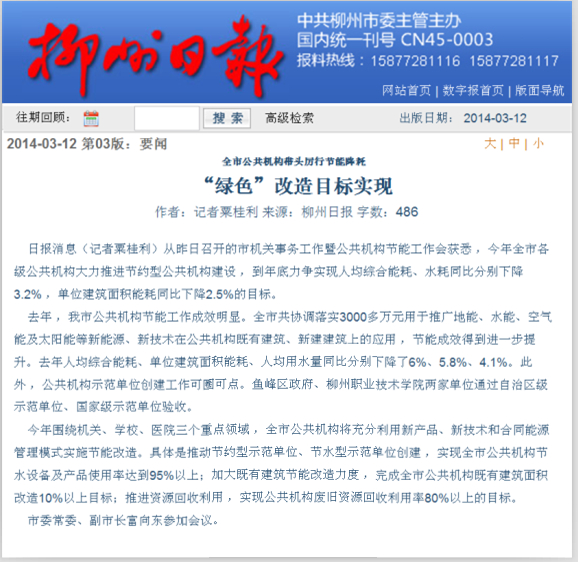 2014年3月12日,柳州日报在第3版以“‘绿色’改造 目标实现”为题,刊发我院通过自治区级公共机构节能示范单位、国家级示范单位验收的消息。(截图:石玉丹)