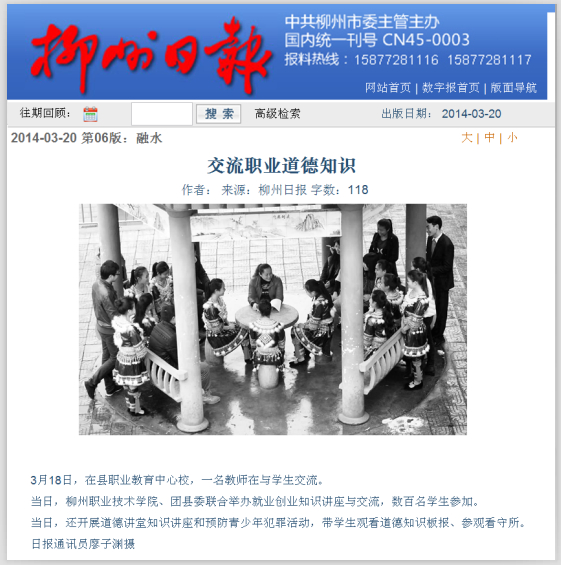 柳州日报刊发我院与融水县团委联办就业创业知识讲座的消息 来源:柳州职业技术学院新闻网 作者:石玉丹 编审: 发布时间:2014-03-28 浏览次数: 次 【字体:小 大】 分享到: 2014年3月20日,柳州日报在第6版,以“交流职业道德知识”为题,刊发我院与融水县团委联合举办就业创业知识讲座的消息。(截图:石玉丹) 关闭 打印正文