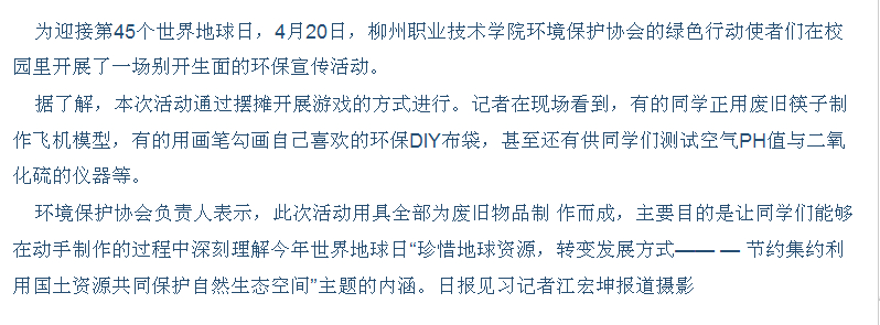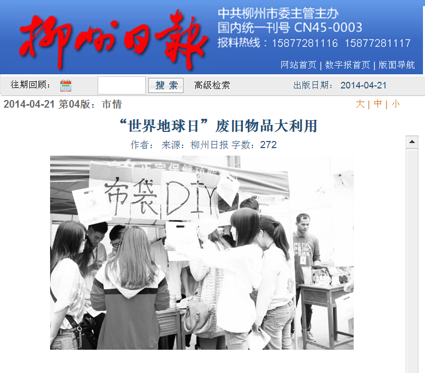 柳州日报刊发我院举办地球日活动的消息 来源:柳州职业技术学院新闻网 作者:石玉丹 编审: 发布时间:2014-04-22 浏览次数: 次 【字体:小 大】 分享到: 2014年4月21日,柳州日报在第4版以“‘世界地球日’废旧物品大利用”为题,刊发我院举办地球日活动的消息。(截图:石玉丹) 关闭 打印正文