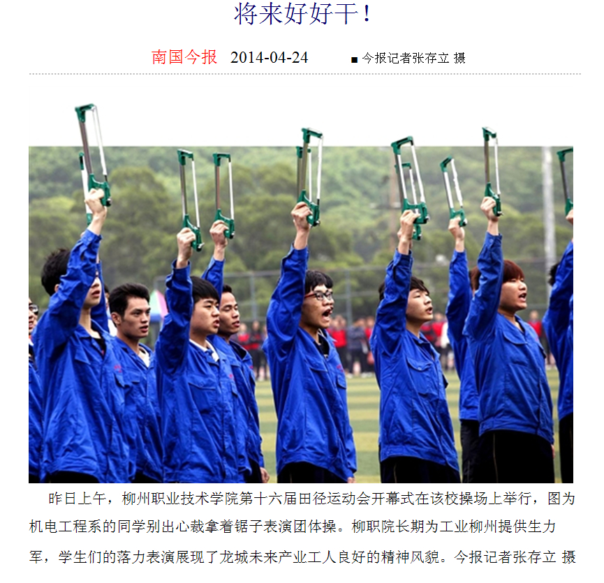 南国今报刊发我院举办第十六届运动会的图片新闻 来源:柳州职业技术学院新闻网 作者:石玉丹 编审: 发布时间:2014-04-24 浏览次数: 次 【字体:小 大】 分享到: 2014年4月24日,南国今报在第4版,以“将来好好干!”为题,刊发我院举办第十六届运动会的图片新闻。(截图:石玉丹) 关闭 打印正文