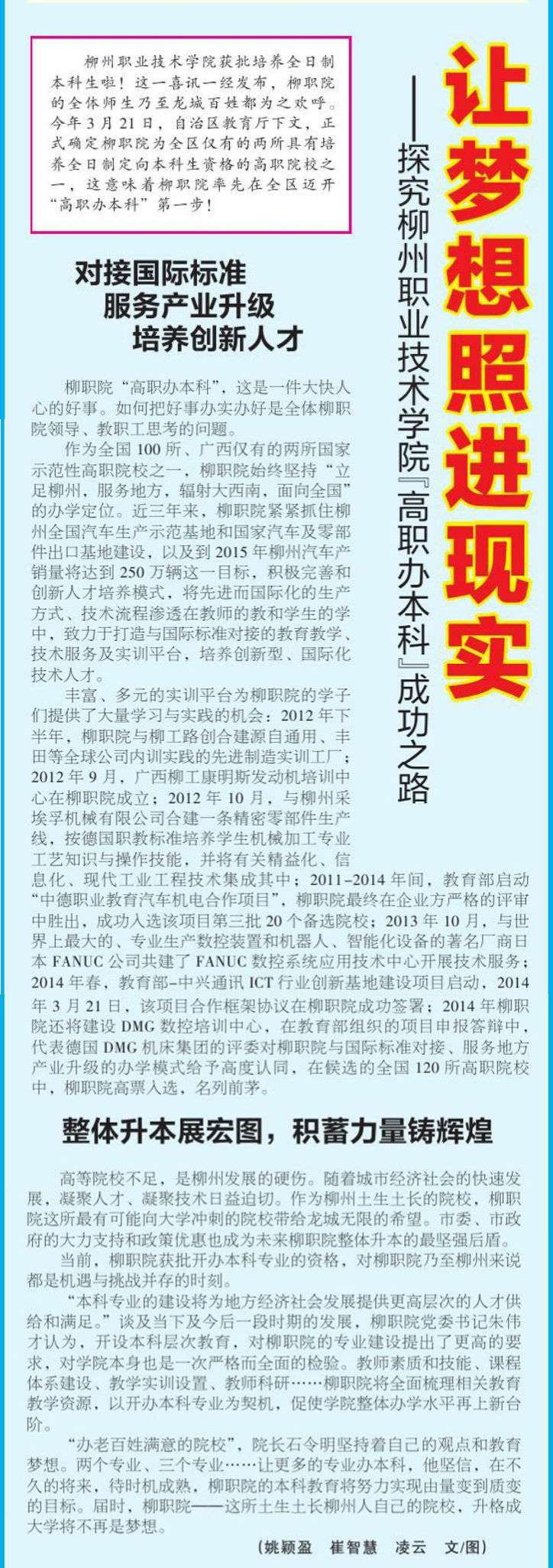 近年来,我院引进国际化的职业标准与职业评价体系、积极调整与优化人才培养模式、主动服务区域经济、服务柳州产业升级、培养与产业升级相适应的技术人才的创新办学成就,赢得社会各界的充分肯定和赞誉,引发当地主流媒体的普遍关注。4月24日,我院创新办学的成就,引来柳州日报、柳州晚报等多家媒体前来采访报道。其中柳州晚报在2014年4月24日头版导读栏目和第5版以“高职试点办本科,实力源自创新来”为题、柳州日报在4月25日2版显著位置以“让梦想照进现实”为题刊发我院创新办学的综述性报道。两报以翔实的事例和数据,大篇幅刊发我院服务社会,做改革、发展、管理的示范,做行业的示范以及主动对接柳州市产业发展,培养高素质、高技能的复合型人才的深度报道,全面概述了我院在创新办学上的努力、讴歌了我院创新“校企深度交融,工学有机结合”的人才培养模式办学思路,纵向反映了我院作为全区仅有的两所高职院校获得试点培养本科人才的雄厚实力,在社会各界引发广泛热议。 (文、图/石玉丹)