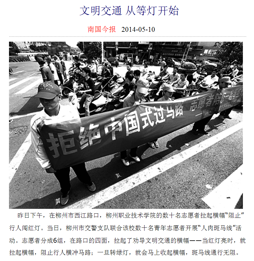 南国今报刊发我院学生举办“人肉斑马线”劝阻行人遵守交规的新闻 来源:柳州职业技术学院新闻网 作者:石玉丹 编审: 发布时间:2014-05-14 浏览次数: 次 【字体:小 大】 分享到: 2014年5月10日,南国今报在第8版、以“文明交通,从等灯开始”为题,刊发我院学生举办“人肉斑马线”活动,劝阻行人遵守交规的图片新闻。(截图:石玉丹) 关闭 打印正文
