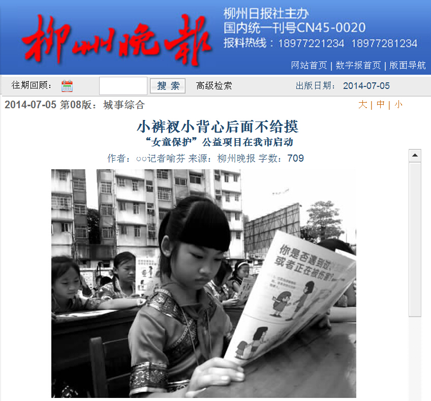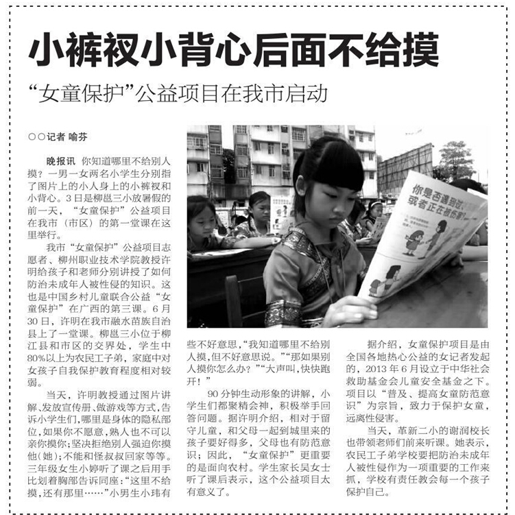 柳州晚报刊发我院开展女童?;す嫦钅炕疃男挛? 来源:柳州职业技术学院新闻网 作者:石玉丹 编审: 发布时间:2014-07-09 浏览次数: 次 【字体:小 大】 分享到: 2014年7月5日,柳州晚报在第5版,以“小裤衩小背心后面不给摸”为题,刊发我院开展女童保护公益项目活动的新闻。(截图:石玉丹) 关闭 打印正文