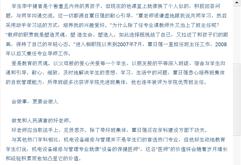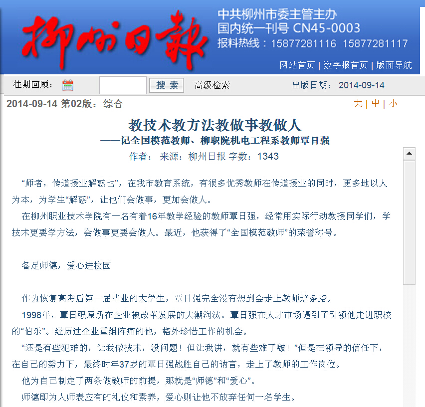 柳州日报在2014年9月14日第2版,以“教技术教方法教做事教做人——记全国模范教师、柳职院机电系教师覃日强”为题,大篇幅刊发我院教师覃日强获得全国模范教师的人物专访。(截图:石玉丹)